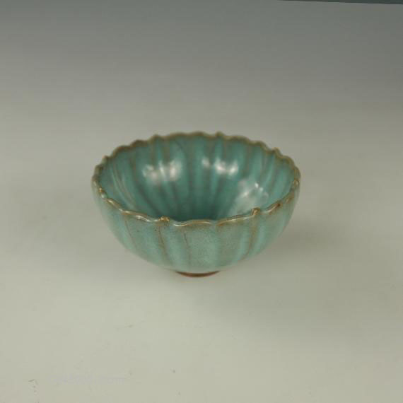 口沿呈八瓣形,弧壁深腹,腹壁内外均凸现与之相对应的莲瓣棱,小圈足。釉呈天蓝色,釉面布鬃眼且伴有开片纹,器口及莲瓣棱处釉薄呈黄色,外壁底有垂釉现象。内外壁满釉,外壁施釉不及底,圈足处无釉。