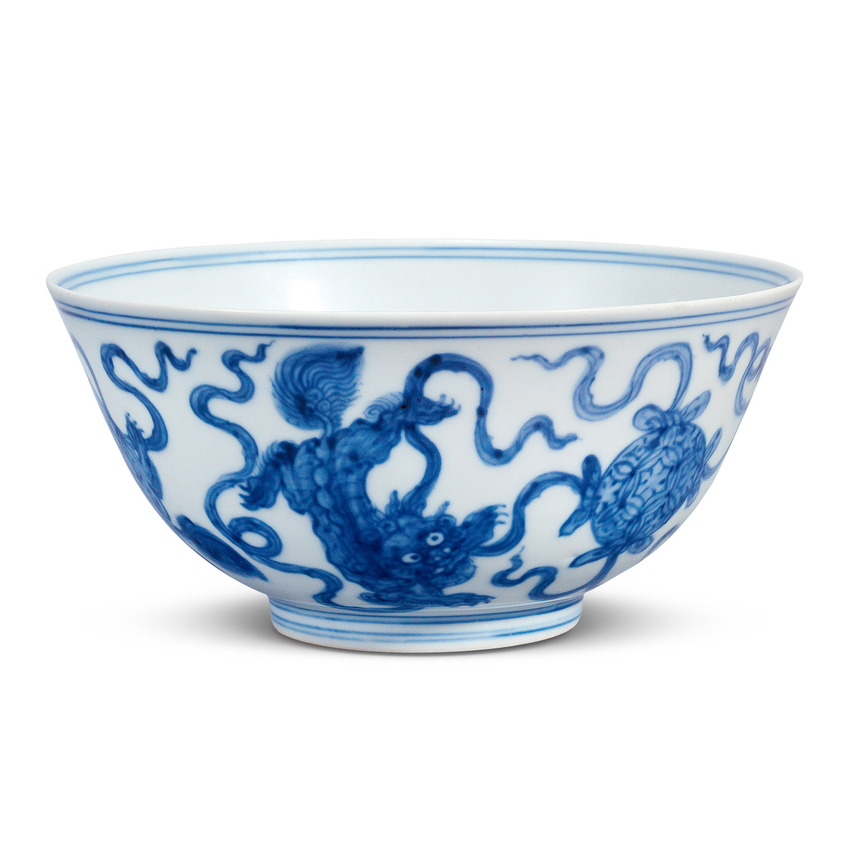 微撇口,深腹,弧线饱满,浅圈足,底满釉。外壁绘两组狮子戏 绣球,呈上下俯仰相迎之势。绘画技法以细笔勾勒狮子毛发轮廓,再 以分水填色,渲染出筋骨肌肉,简练而生动。碗底心双圈内绘立狮踏绣球。釉面平滑莹润,似美玉如凝脂,底釉泛出的自然闪黄也是成化器独有的特征。