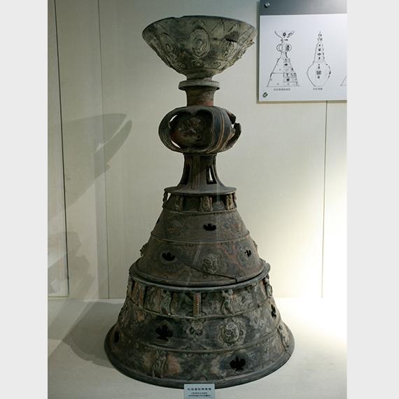 由上、中、下三部分组成,器物顶部为莲花口托盏,外壁贴塑九朵花瓣和一位站立童子;器中部为塔身主体,上塑镂空球体及首面,下为喇叭状,周壁贴塑铺首、彩绘花卉纹开云朵形镂孔;器底呈圆形覆盆状,装饰分三层,上层塑八尊力士,中、下层饰铺首像、彩绘花卉纹和云朵形镂孔。