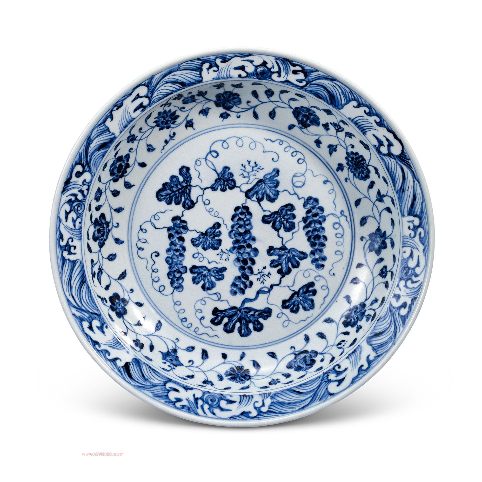 折沿,唇口,用浓艳苏麻离青料绘三连葡萄枝,辅以缠枝花和海水江崖纹,外壁绘饰以缠枝花相配。盘底露胎火石红。
