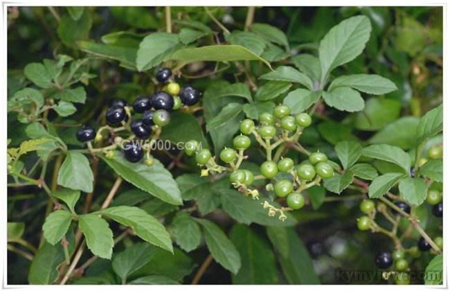 形态特征:茎圆柱形,扭曲,有纵棱,多分枝,带紫红色;卷须二歧分叉,与叶对生。叶皱缩;展平后为鸟足状复叶,小叶5,椭圆形、椭圆状卵形至狭卵形,边缘具疏锯齿,两面中脉有毛茸或近无毛,中间小叶较大,有长柄,侧生小叶较小;叶柄长可达4cm以上。浆果卵圆形,成熟时黑色。气微,味苦、涩。