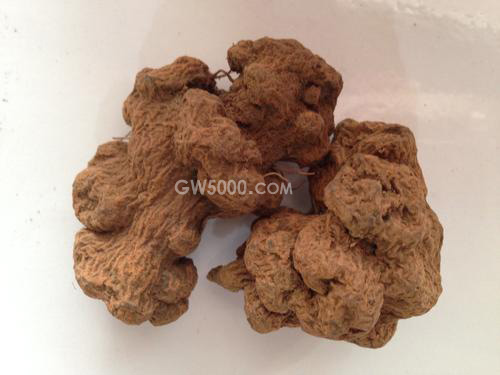 形态特征:块根呈不规则结节状,长6-18cm,直径3-8cm。表面棕黄色至棕红色,有不规则瘤状突起和深皱纹;外皮破裂处呈红棕色。体重,质坚,断面棕色或红棕色,习称“朱砂岔”,角质样。气微闷臭,味极苦。