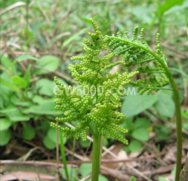 形态特征:根茎长0.5-1cm,直径2-3.5mm,表面灰褐色,下部簇生数条须根。根长约5cm,直径2-3mm,常弯曲,表面黄褐色,具横向皱纹;质脆易断,断面白色,粉性。总叶柄长2-4cm,表面棕黄色,基部有干缩褐色的鞘;营养叶柄长3-8cm,直径1-2mm,三角状而扭曲,具纵条纹,淡红棕色;叶片卷缩,黄绿色或灰绿色,展开后呈阔三角形,三回羽裂,侧生羽片3-4对;叶脉不明显。孢子叶柄长12-25cm,黄绿色或淡红棕色;孢子囊穗棕黄色。气微,味微甘而微苦。