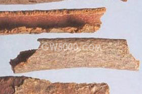 形态特征:本品呈卷筒状或槽状,长5~375px,直径1~100px,厚0.2~7.5px。外表面灰棕色至深棕色,有的可见灰白色地衣斑,粗皮易剥离或脱落,脱落处棕红色。内表面棕色或棕红色,具明显的细纵皱纹。质松脆,易折断,断面颗粒状。气微香,味微涩。