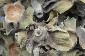 形态特征:本品呈扁圆形,直径1.5~2.5cm。中央较厚,微隆起,有果实脱落后的圆形疤痕,边缘较薄,4裂,裂片多反卷,易碎;基部有果梗或圆孔状的果梗痕。外表面黄褐色或红棕色,内表面黄棕色,密被细绒毛。质硬而脆。气微,味涩。