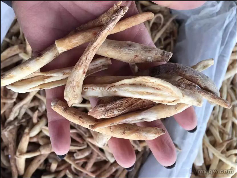 形态特征:呈细长圆柱形、长纺锤形或不规则条块,长6~20cm,直径0.5~2cm。表面黄白色或淡棕色,光滑或有纵沟纹和须根痕,有的具红棕色斑点。质硬而脆,断面角质样,皮部较薄,黄白色,有的易与木部剥离,木部类白色。气微,味淡。