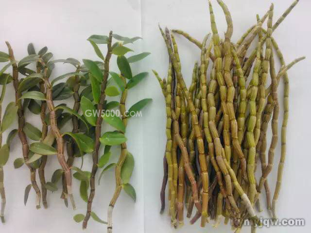 入药部位:为兰科植物金钗石斛Dendrobium nobile Lindl.、鼓槌石斛Dendrobium chrysotoxum Lindl.或流苏石斛Den-drobium fimbriatum Hook.的栽培品及其同属植物近似种的新鲜或干燥茎。
