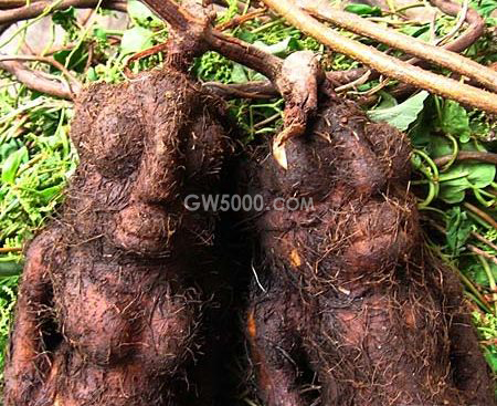 形态特征:本品呈团块状或不规则纺锤形,长6~15cm,直径4~12cm。表面红棕色或红褐色,皱缩不平,有浅沟,并有横长皮孔及细根痕。体重,质坚实,不 易折断,断面浅黄棕色或浅红棕色,显粉性,皮部有4~11个类圆形异型维管束环列,形成云锦状花纹,中央木部较大,有的呈木心。气微,味微苦而甘涩。