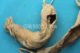 形态特征:根圆柱形,长20-25cm,直径3-4cm,微扁,略扭曲,紫红色或灰褐色,表面不平整,具波状纵皱纹或网状纹理,可见横向排列的黄褐色条纹及长2-3cm的支根或支根痕;顶端具中空的茎基,长1-4cm。质轻,折断面淡黄色而疏松。气微,味略辛。