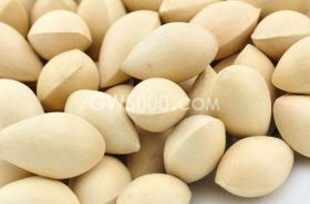 形态特征:本品略呈椭圆形,一端稍尖,另端钝,长1.5~2.5cm,宽1~2cm,厚约1cm。表面黄白色或淡棕黄色,平滑,具2~3条棱线。中种皮(壳)骨质,坚硬。内种皮膜质,种仁宽卵球形或椭圆形,一端淡棕色,另一端金黄色,横断面外层黄色,胶质样,内层淡黄色或淡绿色,粉性,中间有空隙。无臭,味甘、微苦。
