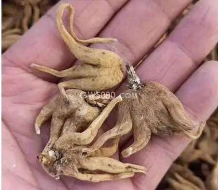 形态特征:手参块茎稍扁,形如手掌,长1-4.5cm,直径1-3cm,表面浅黄色或暗棕色,有细横皱纹,顶端有茎残基,其周围有点状根痕;下部有4-12指状分枝,分枝长0.3-2.5cm,直接2-8mm。质坚硬,不易折断,断面黄白色,角质样。气微,味淡,嚼之发粘。以色黄白、质坚实、断面角质样、嚼之粘性大者为佳。