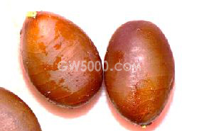 形态特征:干燥种子呈长椭圆形,一端略狭尖,长1.1-1.3cm,宽0.7-0.8cm,厚约0.7cm。表面棕褐色,平滑而带有光泽,较狭尖的一端有微凹的点状种脐,有的不甚明显。种皮剥落后可见2片大型鲜黄色的子叶,质极坚硬,气微,味淡。以颗粒饱满、坚实、无杂质、无虫蛀者为佳。