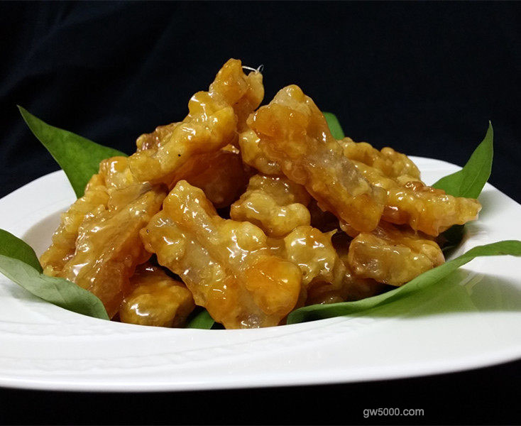 - 9倒入炸好长条肉迅速翻炒裹上糖稀