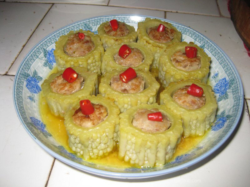 苦瓜洗净,切段,将里面的馕用勺子掏出。