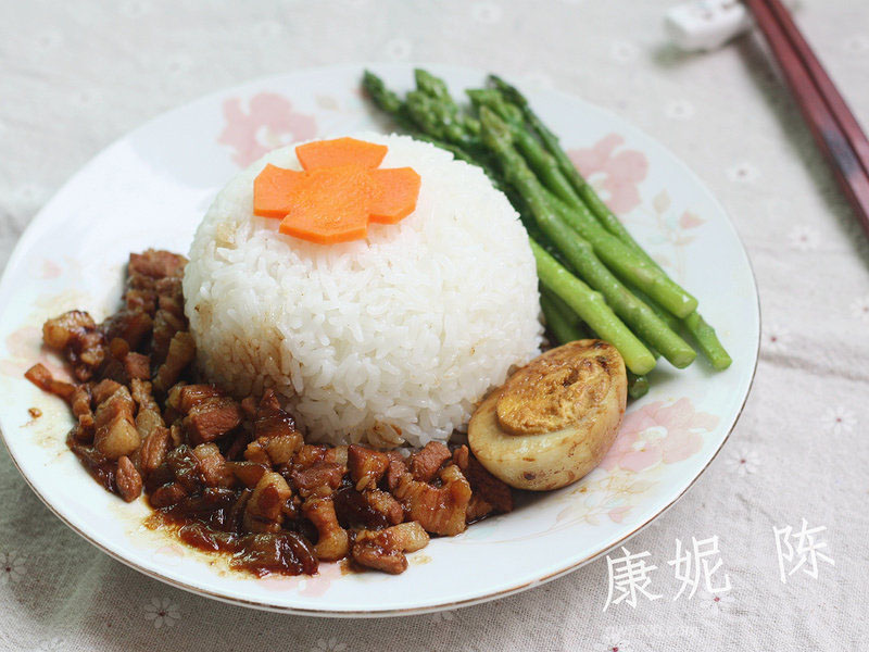 14盘子里舀一碗饭,浇上卤肉,拌上芦笋好胡萝卜片。
