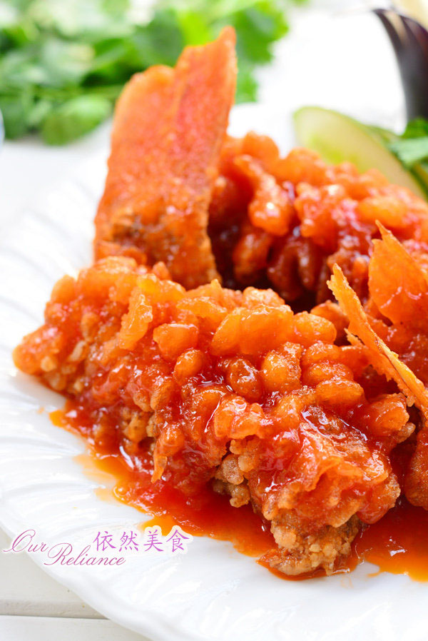 11.材料:彩云雕1只生姜一小块大蒜3瓣调料:番茄沙司1碗酸醋1汤勺半调和油适量料酒1汤勺盐巴味精适量蒸鱼鼓油半勺白糖2汤勺白胡椒适量淀粉1碗把彩云雕分开切好下巴三角处留着。