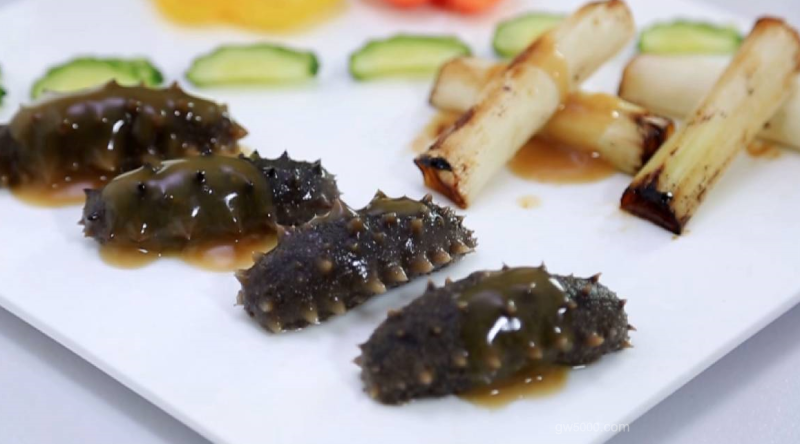 倒入海参煮沸,倒入少量料酒,淋入水淀粉勾芡。淋入椒油,放入葱段翻炒。