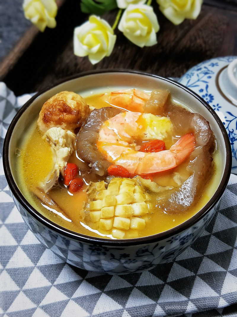 南瓜是熬出金汤的关键,接着放入大虾和鹌鹑蛋,家中有枸杞也可以放入一些,继续小火熬半个小时,出锅前尝一下汤汁,再放盐和鸡精调味即可。