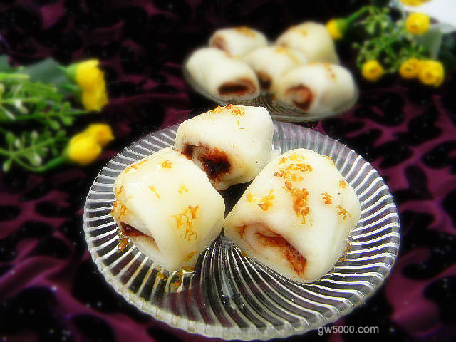 豆沙馅我用的是买现成的,甜度够。表面又淋上桂花糖,所以,在蒸米粉的时候我就没有再加糖,免得过甜。喜欢再甜一些的,可以在混合米粉的时候加点糖。