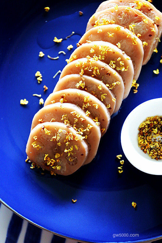 1、晾凉后切片,浇原汁或者糖桂花都可以。