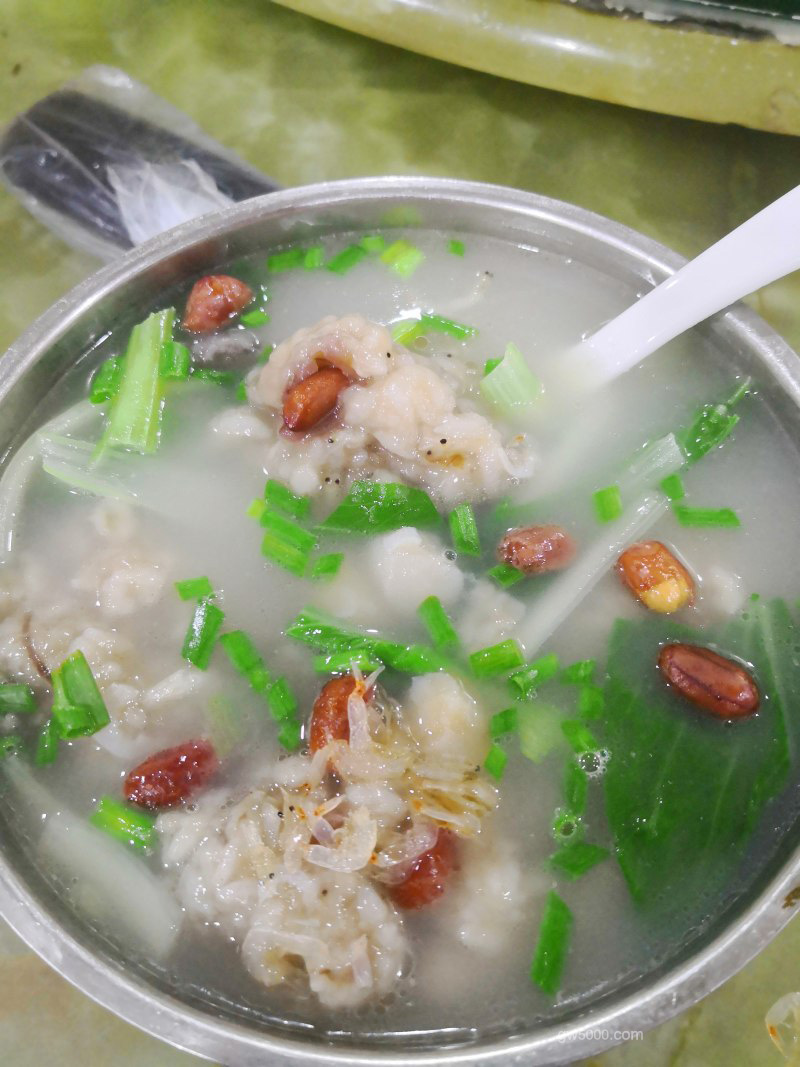 粉仔粿煮熟捞到大骨汤里,撒上葱花,大工告成丨