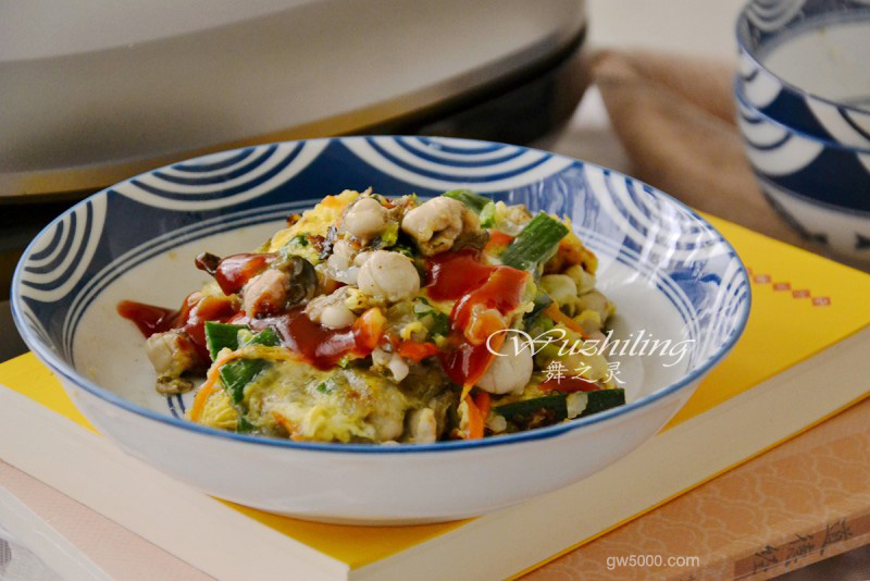 - 9可以启动上下火盘,将上盘盖上片刻,蛋液就凝固了、盛出来,淋上泰式酸辣酱即可。
