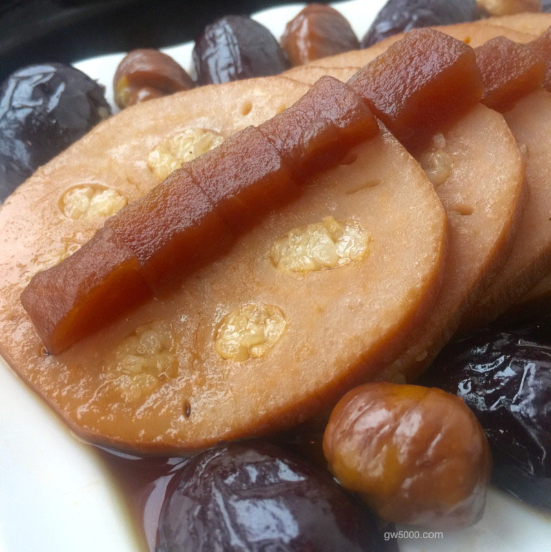 糯米要用筷子一点点塞进孔里,必须压实。煮糯米的汤里可以随意放自己喜欢的食材,比如梨、莲子、百合等等。