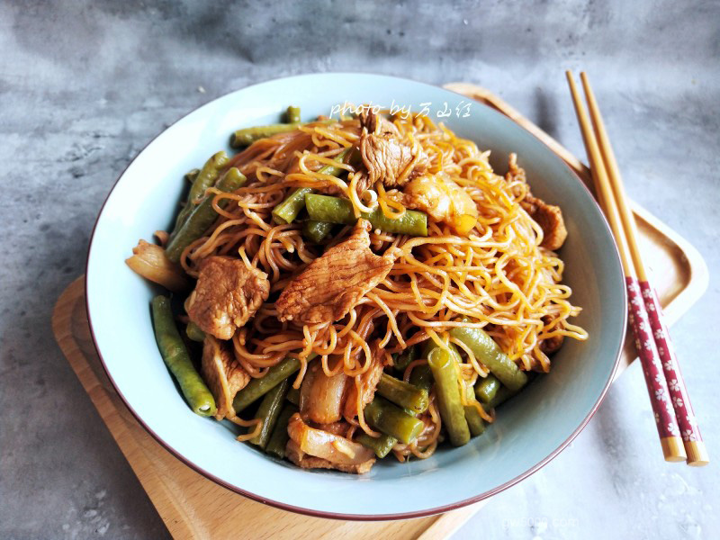 - 11翻炒均匀加半碗开水,水的量大约是300毫升,这样基本可以被500克面条吸收。水的多少很关键,太多面条太湿,太少则过干都会影响口感很味道。