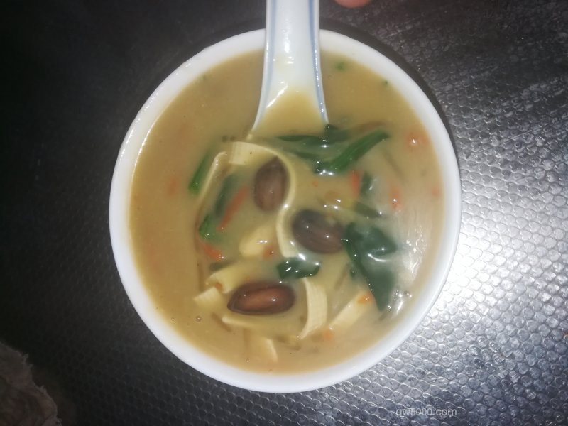 - 15加入碱面4g,绝对不能放多,要不然这锅豆沫会有很大的碱面味道难以下咽,切记切记!完了煮3分钟,你还会发现豆沫变得更加黄了,这是碱面的效果,而且整个香味扑鼻而来。