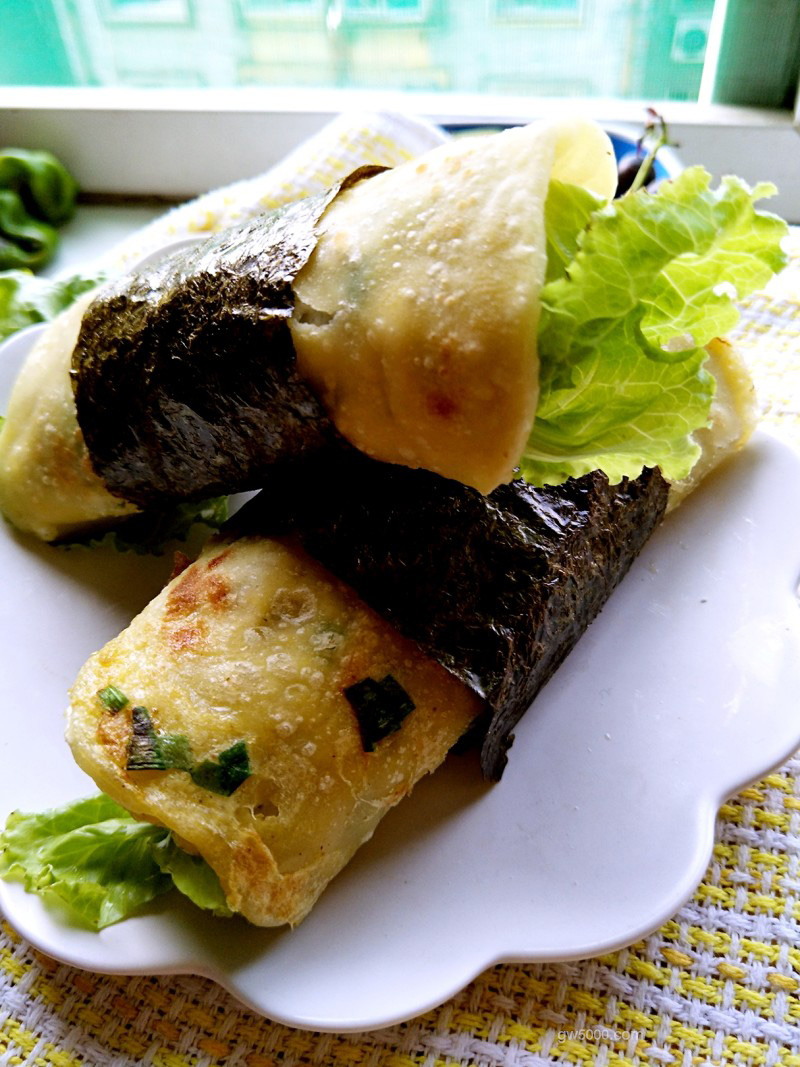 用紫菜条卷起鸡蛋灌饼,吃时手不油腻,还使早餐食物多样性