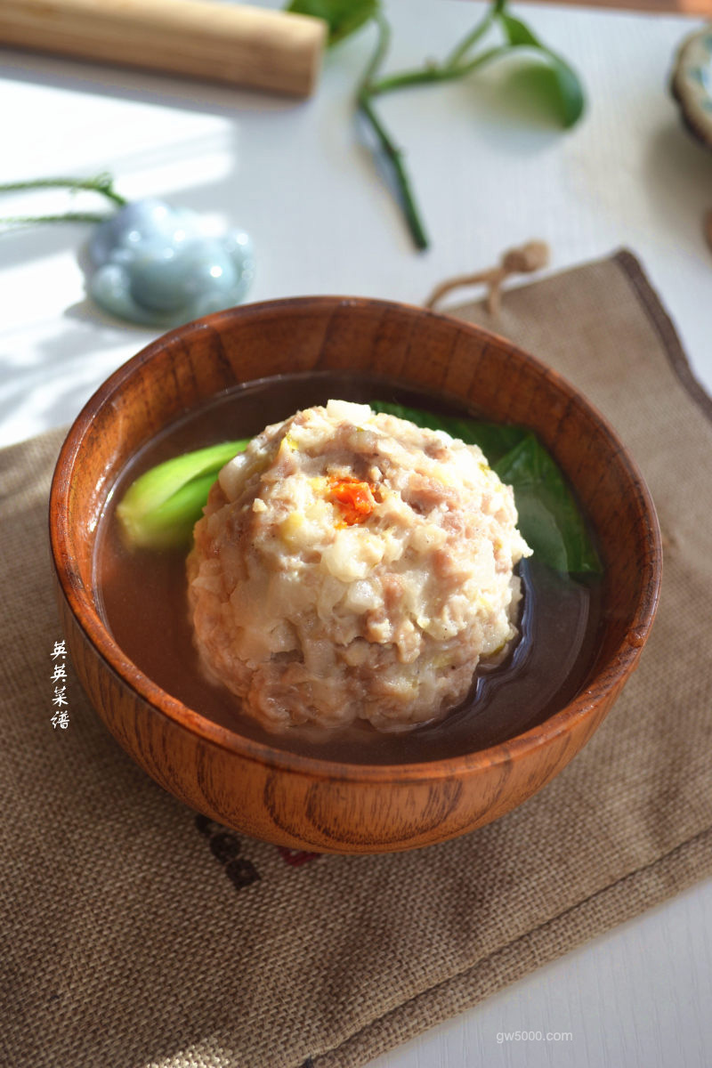 - 13蟹黄狮子头成熟,青菜可以放入汤中烫熟。