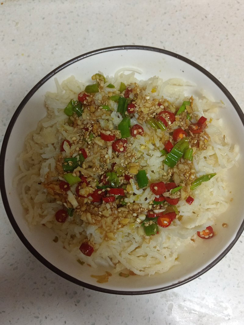- 18把酱汁浇在蒸熟的洋芋丝上,美味既成。