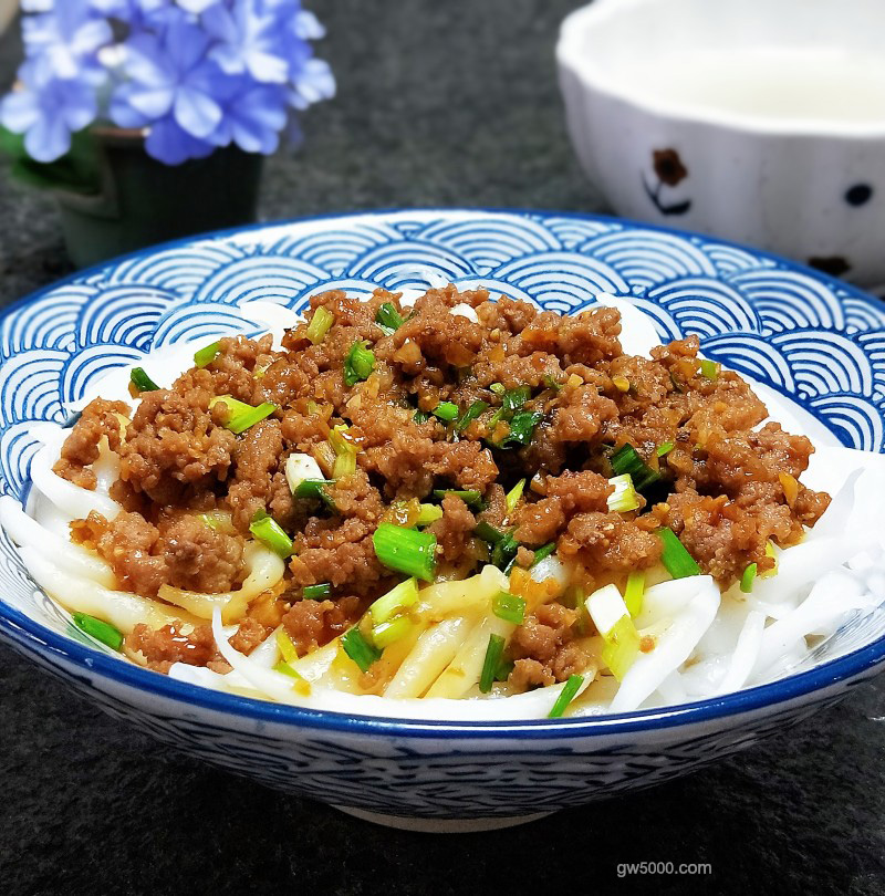 - 13最后撒入香油、鸡精和葱花,关火。把做好的肉酱料浇入老鼠粄表面即可。