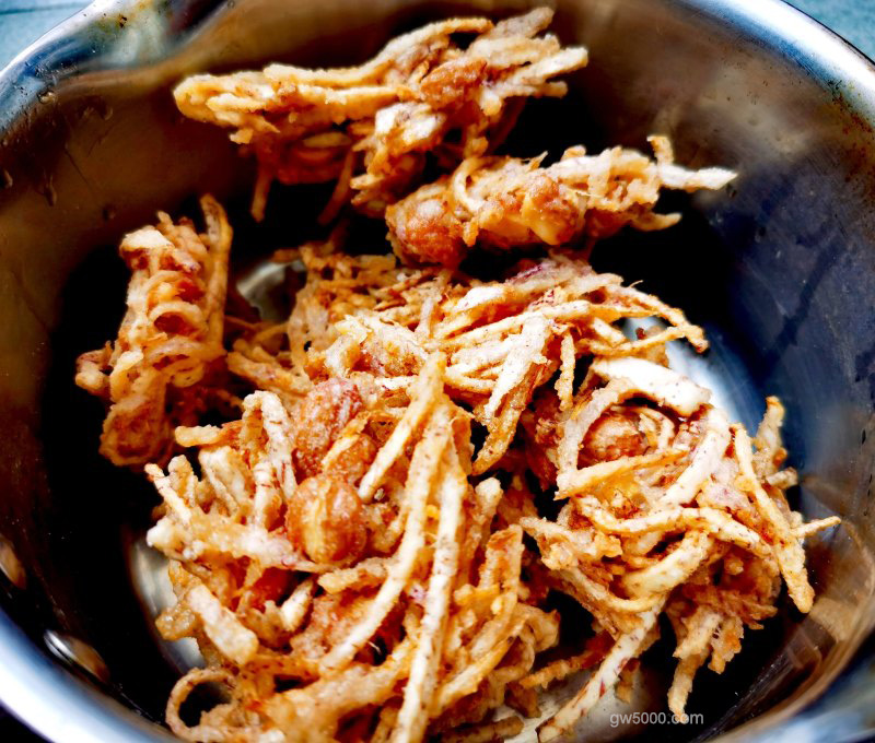 炸至金黄后,控油捞出。