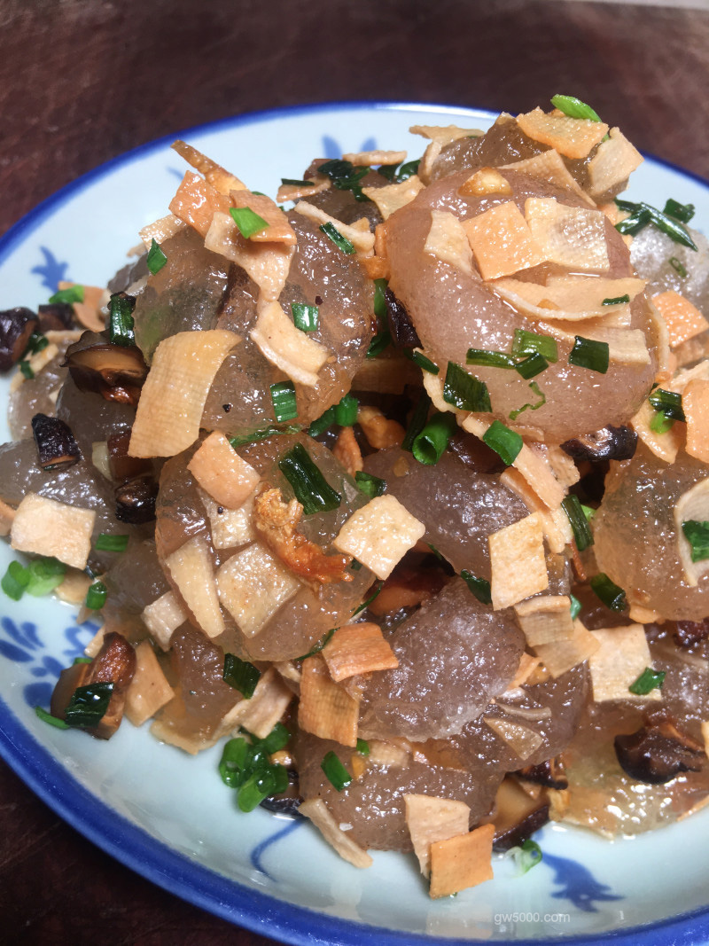 翻炒片刻加入葱花,鱼露就可以出锅了(算盘子本来就熟的,所以不需要煮太久)。