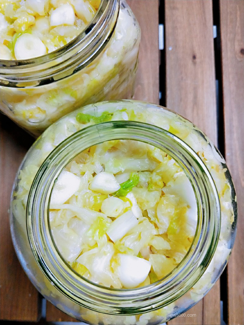 - 11冬菜压紧实,装至瓶颈,不要太满,表面撒上白酒盖面,即完成。
