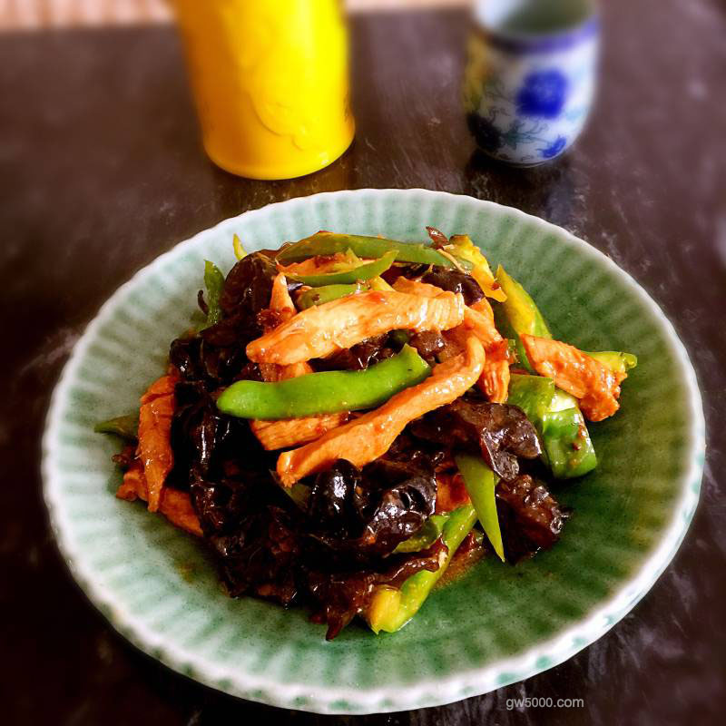 鸡肉切长条加入生粉、生抽拌匀,黑木耳、青椒切一下,淀粉水备用