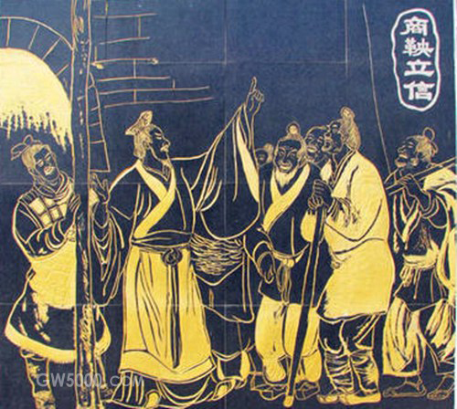 商鞅立木建信是战国时期发生在秦国国都的一个事件。当时商鞅变法推出新法令,怕民众不信任,放了一根木头在城墙南门,贴出告示说:如有人将这根木头搬到北门就赏十金。所有民众都不信。直到将赏金提升至五十金时,才有一壮士将木头搬到了北门,商鞅如约赏给了他五十金。此举取得了民众对商鞅的信任,终于商鞅公布了变法的法令。这个故事也称商鞅立信。