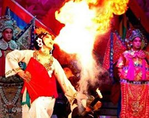 鞭扫灯花;《太和城》中的孙武子与《黄河阵》中的闻仲用此技。前者是表现孙武子得胜后的兴奋情绪;后者是表现闻仲盛怒与神威,二者都有烘托舞台气氛、增强演出效果的作用。其表演法是:先用黄表纸在鞭梢扎成约四寸多长的纸花,然后加足灯油,拉长灯捻(用纸裹香做成),使其多出灯花。