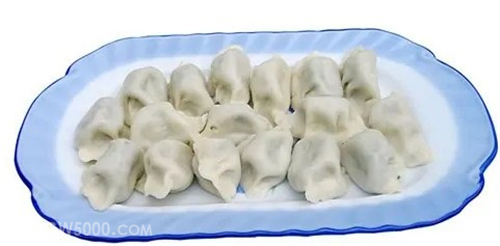 3、水烧开,下入水饺,中间点两次凉水烧开,水饺熟后捞出即成。
