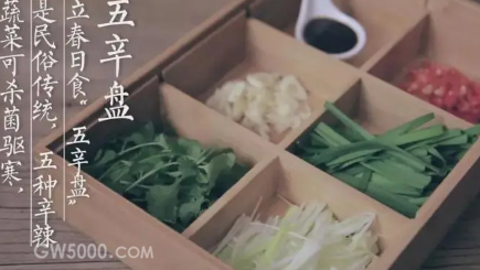 五辛盘又被称为馈春盘,据历史记载,五辛盘最早起源于汉朝,它主要由大蒜、小蒜、韭菜、云苔、胡荽等五种蔬菜组合而成。此外,根据南朝梁文学家宗懔撰写的《荆楚岁时记》可知:“元日,……进屠苏酒,下五辛盘。”古代会在立春与新年有吃五辛盘的习俗,因为“辛”与“新”同音,含有迎春纳福之意。