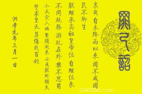 所以,“罪己诏”的起源,古人认为是从“禹、汤罪己”开始的。据古籍记载:大禹登上帝位后,有一次,无意中看见了犯罪的人,就伤心地哭了起来,左右问其故,禹曰:尧舜之时,民皆用尧舜之心为心,而予为君,百姓各以其心为心,是以痛之。