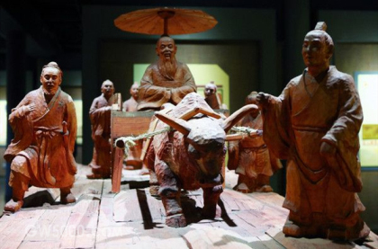 太师挚适齐,亚饭干适楚,三饭缭适蔡,四饭缺适秦,鼓方叔入于河,播鼗武入于汉,少师阳、击磬襄入于海。