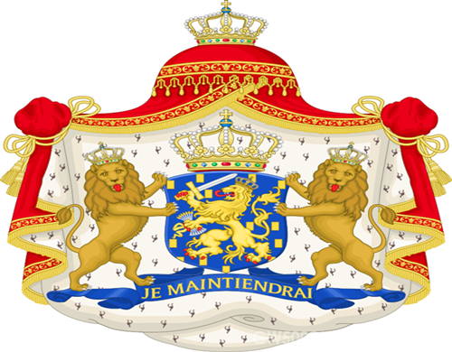 荷兰国徽既奥兰治拿骚王朝王徽是在1815年根据皇室法令制定的。一顶红色貂皮华盖如开启的幕布,下部嵌有一条写着威廉亲王的法语誓言“我将一如既往”(Je Maintiendrai!)的蓝色饰带,两只跨立的金狮翘着尾巴,口吐红舌护着一面蓝色盾徽。