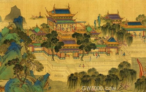 以环翠门前荡秋千的仕女群像为例,场景中虽仅五六人,却代表了当时女子的典型装束,那个坐在踏板上正在荡秋千的女子,上着襦衣下穿齐腰长裙,图中女子所穿襦衣交领右衽、窄袖,中系腰带和宫绦,下穿多幅长裙,裙腰与腰部齐平,裙长至脚踝骨之下,这种装束充分继承和发扬唐宋时期的服饰特色。