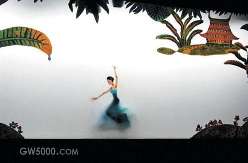 剧目在傣族音乐声中幕启:以蓝色圆圆月亮为主体画面,一位傣族少女在月光下的背影阿娜多姿、翩翩起舞。时而扭动腰肢由上至下,时而双臂舒展左右摆动,以一种舒缓的节奏慢中有快、点线结合,突破皮影正面与侧面的自由转换,较好地完成皮影戏的舞蹈性。