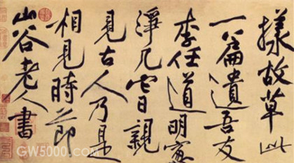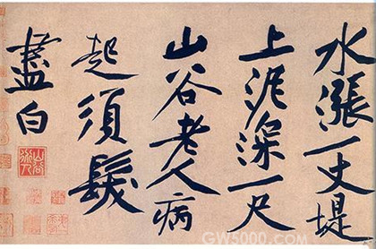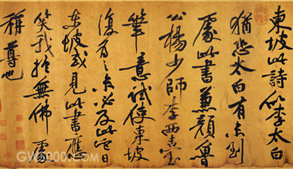 在结构上明显受到怀素的影响,但行笔曲折顿挫,则与怀素节奏完全不同。在他以前,圆转、流畅是草书的基调,而黄庭坚的草书单字结构奇险,章法富有创造性,经常运用移位的方法打破单字之间的界限,使线条形成新的组合,节奏变化强烈,因此具有特殊的魅力,成为北宋书坛杰出的代表,与苏轼成为一代书风的开拓者。后人所谓宋代书法尚意,就是针对他们在运笔、结构等方面更变古法,追求书法的意境、情趣而言的。黄庭坚与苏轼、米芾、蔡襄等被称为宋四家。