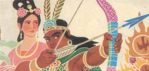 这时,有个年轻英俊的英雄大神叫后羿,他是个神箭手,箭法超群,百发百中。他被天帝召唤去,领受了驱赶太阳的使命。他看到人们生活在火难中,心中十分不忍,便暗下决心射掉那多余的九个太阳,帮助人们脱离苦海。