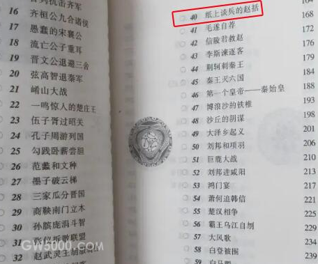 至于我们如今提到“纸上谈兵”便想到赵括,则主要源于近现代文学家林汉达的《上下五千年》这本书,书中以白话文书写了很多历史人物和故事,其中第四十个故事的标题便是“纸上谈兵的赵括”。