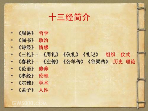 《十三经》是儒家文化的基本著作。就传统观念而言,《易》、《诗》、《书》、《礼》、《春秋》谓之“经”;《左传》、《公羊传》、《谷梁传》属于《春秋经》之“传”;《礼记》、《孝经》、《论语》、《孟子》均为“记”;《尔雅》则是汉代经师的训诂之作。